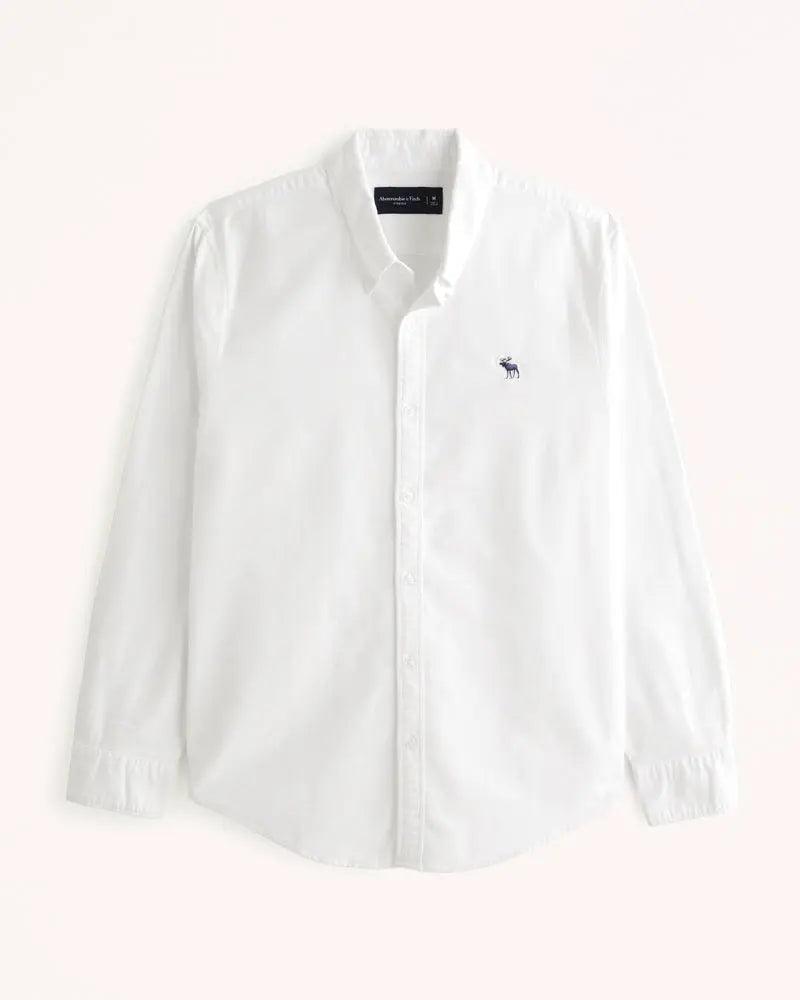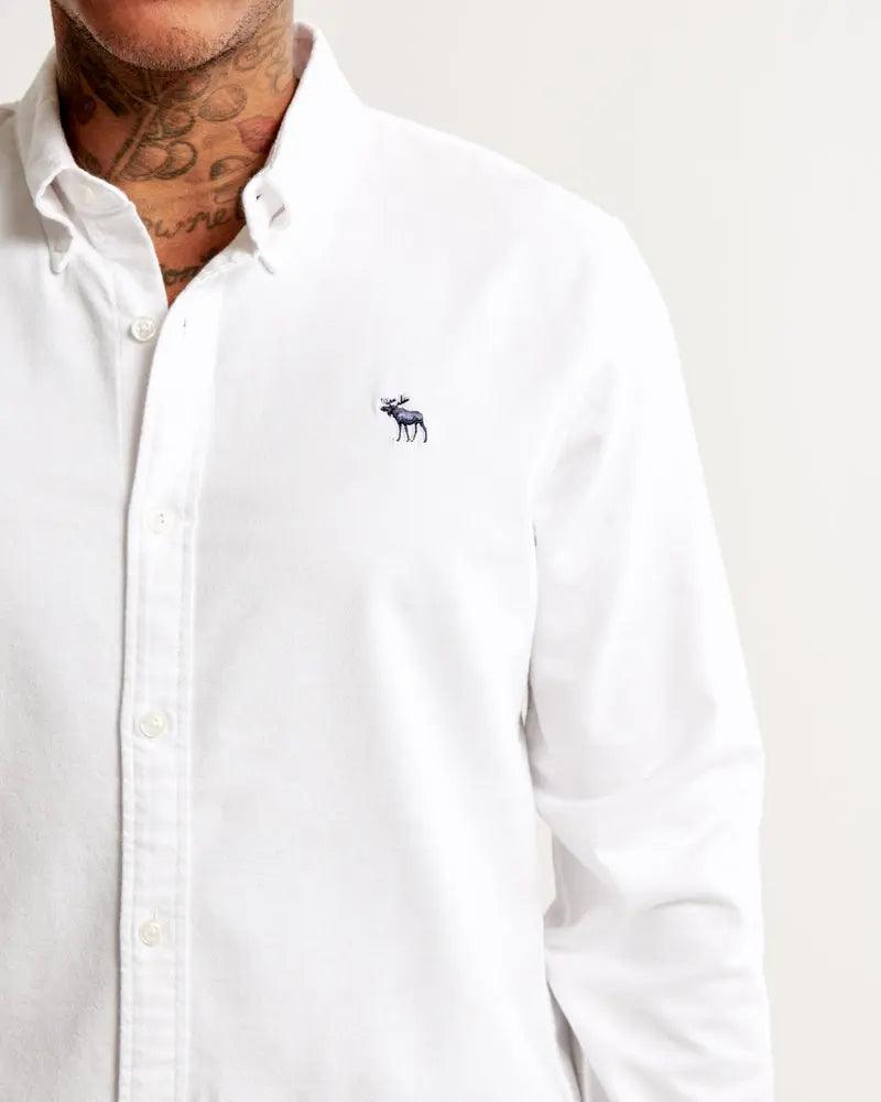 Camisa oxford clássica com botões em tecido elástico de mistura de algodão, com propriedades de elasticidade bidirecional, ícone bordado elevado no lado esquerdo do peito, bainha curva e gola clássica com botões. Importado.
