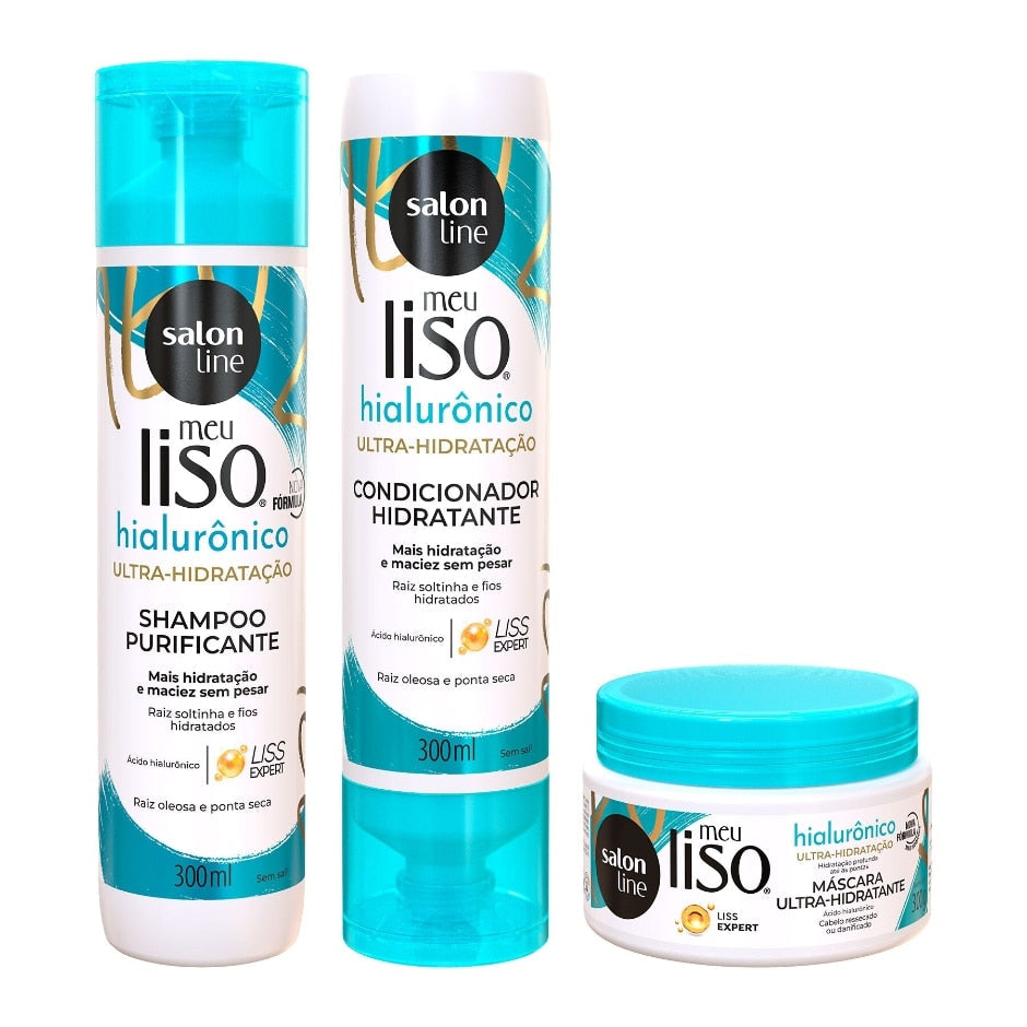 Kit Salon Line Meu Liso conta com 1 Shampoo, 1 Condicionador e 1 Máscara de Hidratação da linha SPA Capilar Ácido Hialurônico. Combinados, garantem restauração e reparação das fibras capilares, hidratação profunda, elasticidade aos fios e cabelos brilhosos.