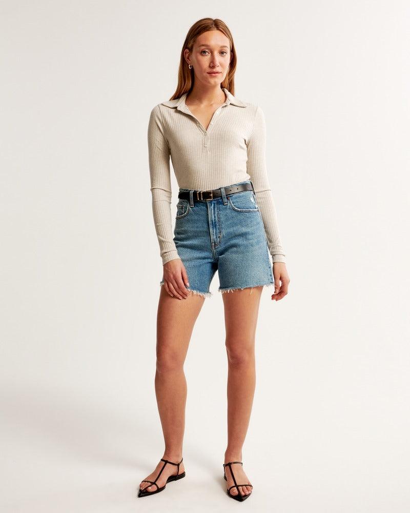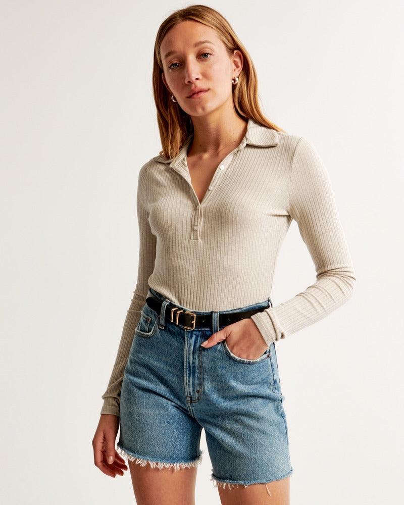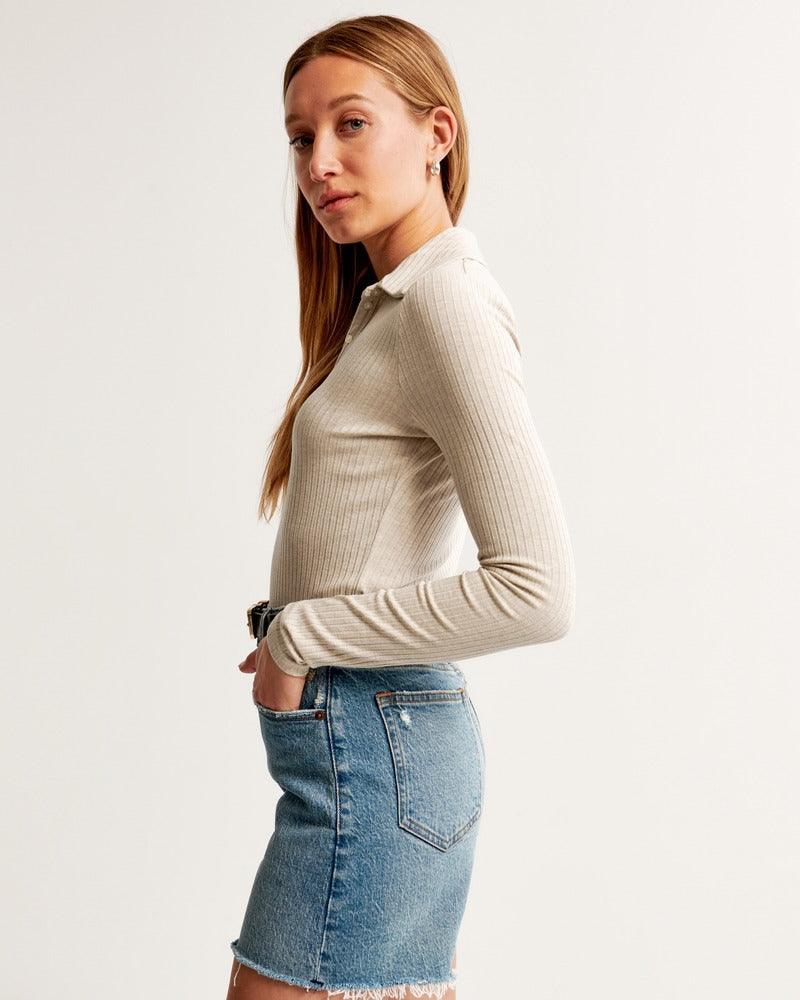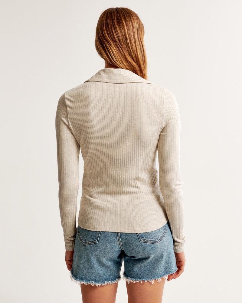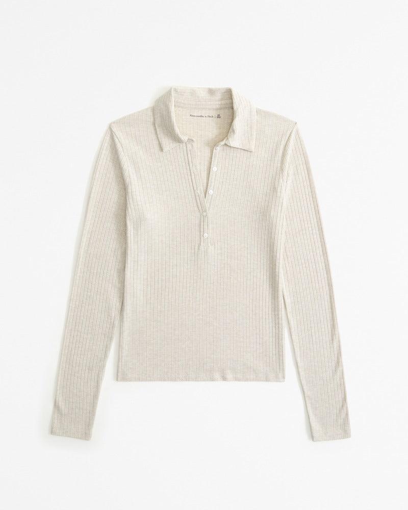 Top lisonjeiro de manga comprida em nosso tecido canelado largo e silhueta justa ao corpo, com gola polo clássica, botões na frente e detalhes canelados em toda a peça. Importado.